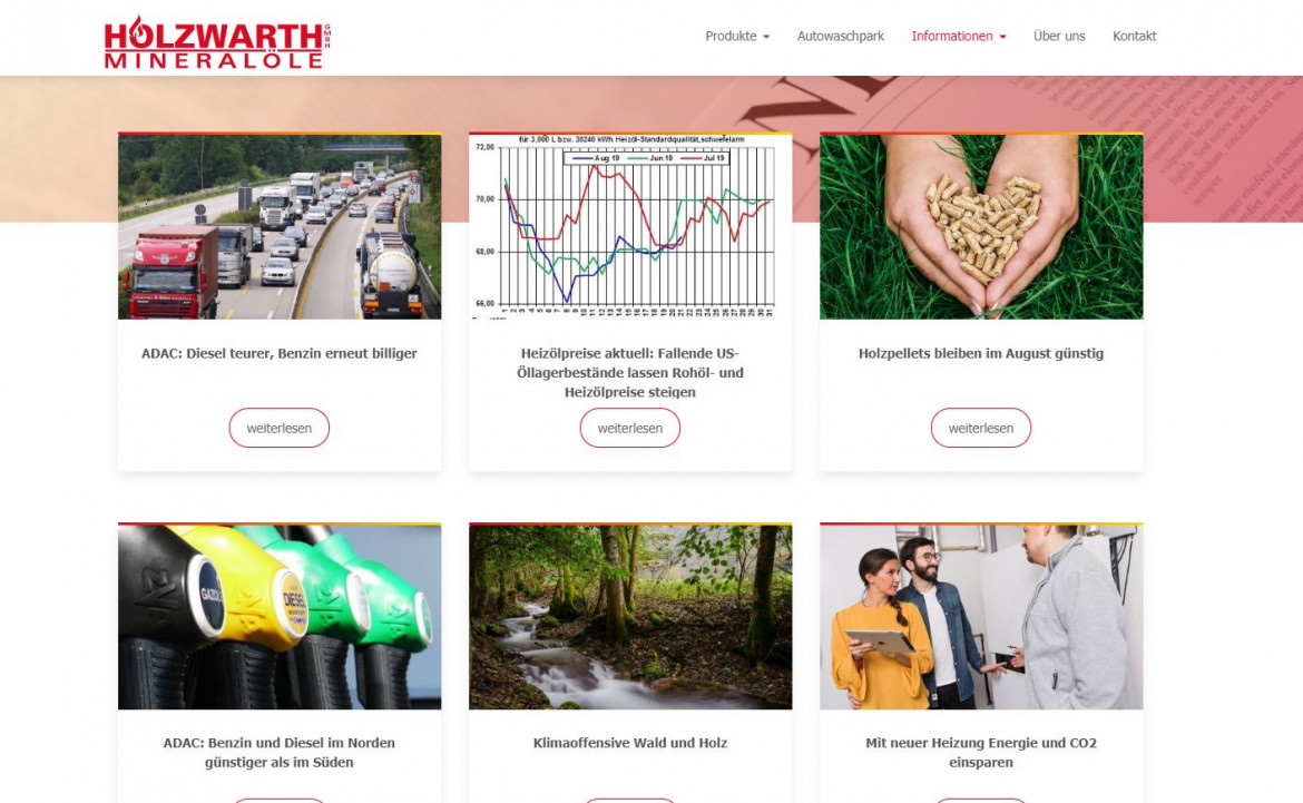 Kunden haben die Möglichkeit, Ihr Heizöl bequem über ein Wärmekonto zu bezahlen. Tägliche Energienews halten Verbraucher in puncto Heizöl-Preisentwicklung und Energiesparen auf dem Laufenden. Geplant ist auch eine Preisanfrage für die Produkte Heizöl, Pellets und Diesel.
