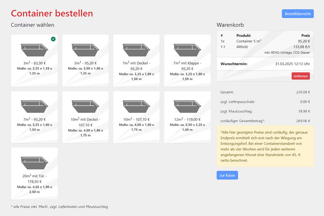 Sie sind der Fachmann für die Entsorgung. Damit dies Ihre einzigen „Sorgen“ sind, bieten wir Ihnen ein Modul zur Containerbestellung, welches einfach auf Ihrer eigenen Website integriert werden kann.